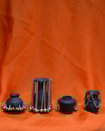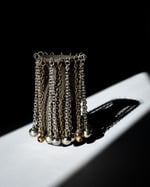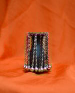 This tall, narrow bud vase is adorned with stainless steel and brass chain and bells, inspired by the jewellery of the Bedu women of the Arabian Peninsula. Measures 8cm by 4cm.